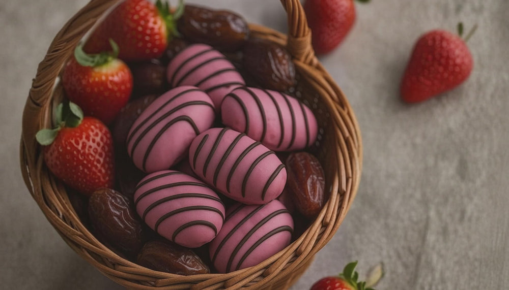 Strawberry-flavoured chocolate-covered dates are made from dates filled with almond centres and coated in strawberry-flavoured chocolate. Strawberries are rich in nutrients, antioxidants and fibre, and are known to help support healthy blood pressure.